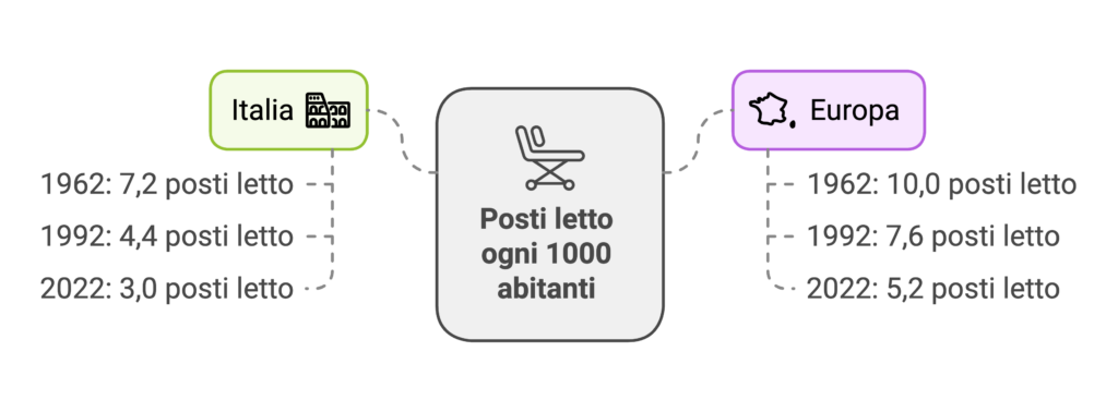 - nel 2022 in Italia vi erano 3,0 posti letto ogni 1000 abitanti (in Europa 5,2).