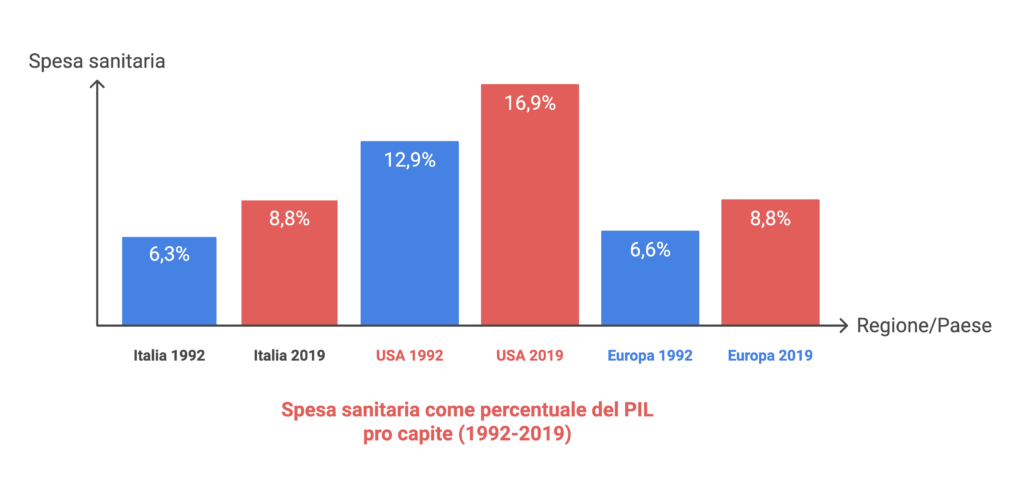 Andando avanti ed analizzando la spesa nel trentennio successivo dal 1992 al 2019, dopo quindi l’introduzione del “nuovo sistema”, la spesa sanitaria pro capite in Italia è passata dal 6,3% al 8,8% del PIL pro capite, mentre negli Stati Uniti è passata dal 12,9% al 16,9% del PIL pro capite. Nello stesso periodo, la media europea è passata dal 6,6% al 8,8% del PIL pro capite.