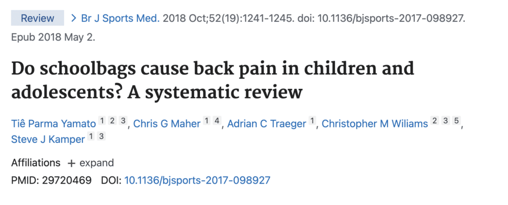 Ad esempio una revisione sistematica pubblicata nel 2018 nel British Journal of Sports Medicine ha esaminato questo tema e ha concluso che non ci sono prove sufficienti per dimostrare che il peso o il design degli zaini causino direttamente dolori alla schiena nei più giovani. Sebbene alcuni bambini possano avvertire disagio legato alla percezione del peso, gli studi di alta qualità non evidenziano un legame causale significativo tra le caratteristiche degli zaini e il mal di schiena.